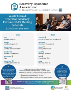 The goal of the RRA Work Team is to increase the quality of Recovery Residences in San Diego County and to maintain a focus on the whole-person approach to recovery. There is representation from Behavioral Health Services, housing policy consultation, legal consultation, public safety groups, recovery residence operators, and treatment providers.